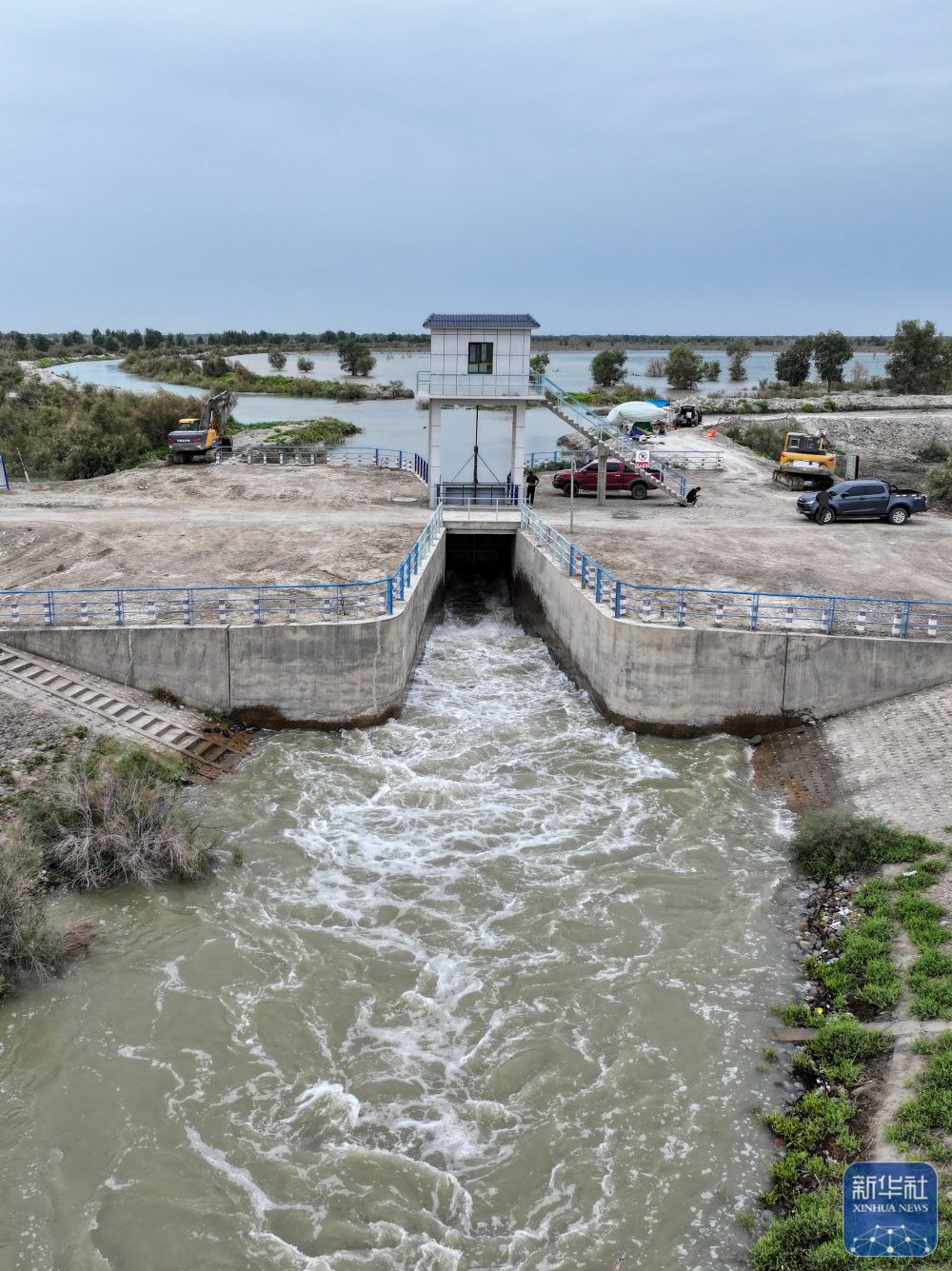↑在新疆阿克蘇地區(qū)沙雅縣蓋孜庫木鄉(xiāng),一處生態(tài)閘在進(jìn)行引洪灌溉胡楊林(8月4日攝,無人機(jī)照片)。