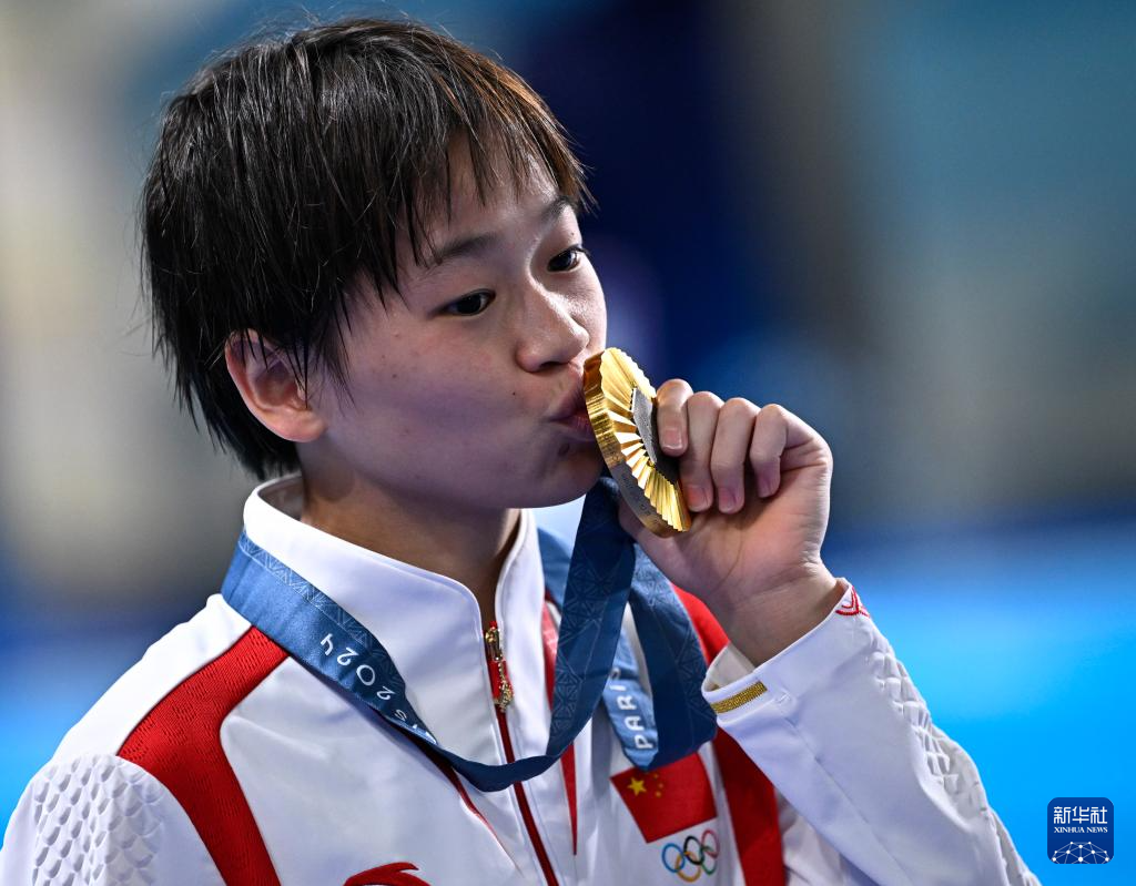 8月6日,全紅嬋展示金牌。新華社記者 王鵬 攝