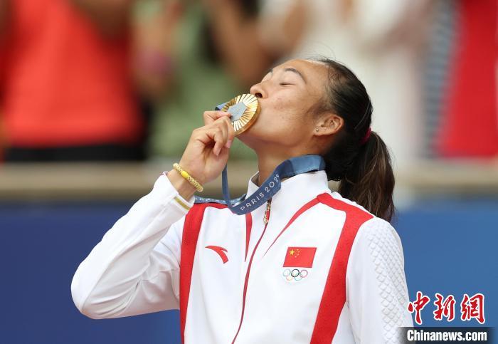 當?shù)貢r間8月3日,在巴黎奧運會網(wǎng)球女子單打比賽中,中國選手鄭欽文以2:0勝克羅地亞選手維基奇,獲得金牌。圖為鄭欽文親吻金牌。中新社記者富田攝