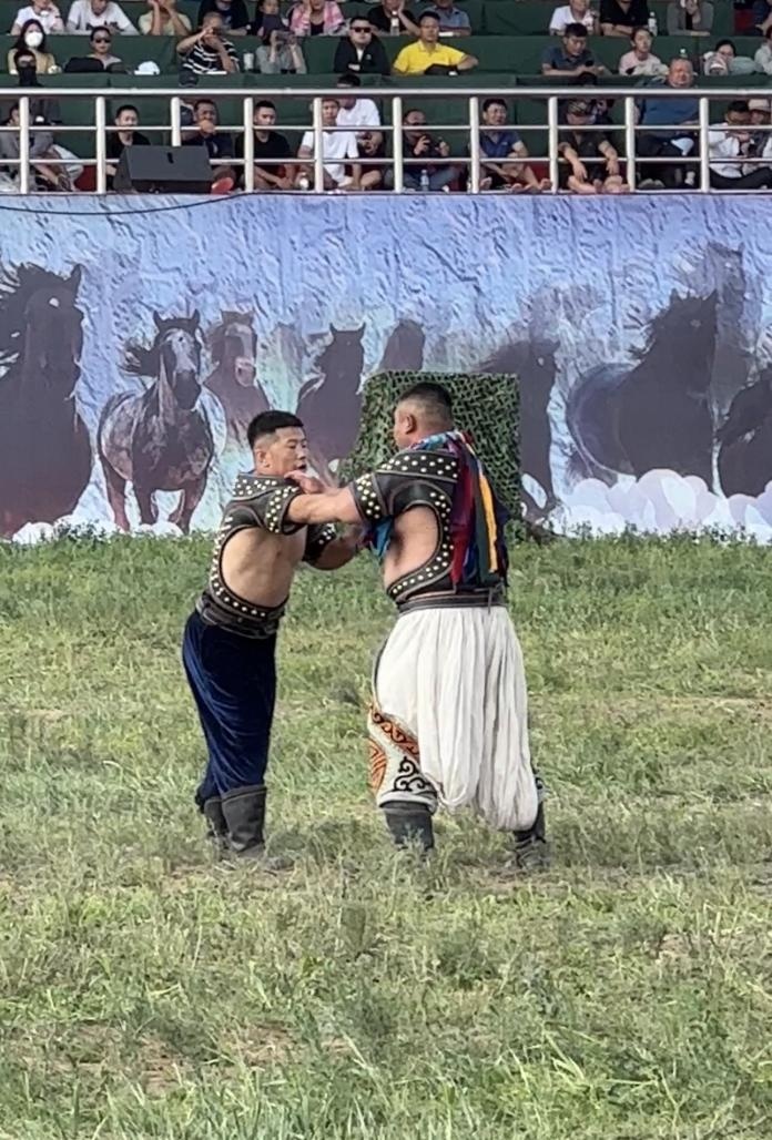 阿斯琴:包括腰力、轉(zhuǎn)動能力和手臂的力量。(牧民的傳統(tǒng))馴馬、馴牛、馴駱駝,不能用蠻力,要有巧勁,要有這方面的天賦才行。比賽規(guī)則就是單排淘汰,倒了就不能再上了。一跤定勝負,這是它摔跤的特點。