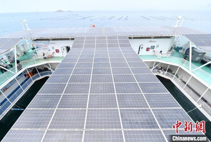 圖為平臺(tái)上配備的光伏電板,實(shí)現(xiàn)平臺(tái)綠色低碳可持續(xù)發(fā)展。中新社記者 呂明 攝
