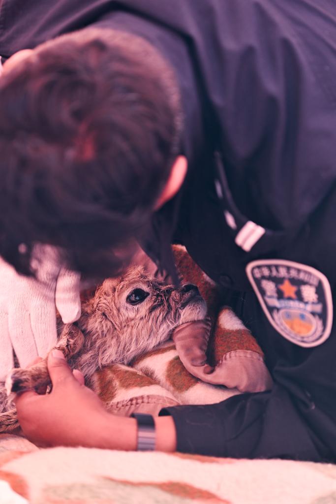 很難想象,這些面龐黝黑、身材魁梧的藏族漢子會趴在一只小藏羚羊身邊,一邊輕柔地給它擦拭身體,一邊像安撫哭鬧的孩子一樣,輕聲細(xì)語地告訴它:“不要害怕,我們來救你了”。