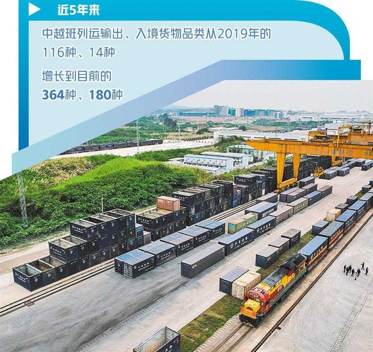 數(shù)據(jù)表明,高效、實惠、便捷的中越班列已得到市場認(rèn)可。近5年來,中越班列運(yùn)輸出、入境貨物品類從2019年的116種、14種,增長到目前的364種、180種。中越班列集貨地已覆蓋廣西及周邊省份20多個地市,跨境貨物運(yùn)輸覆蓋越南、老撾、泰國等多個東盟國家。