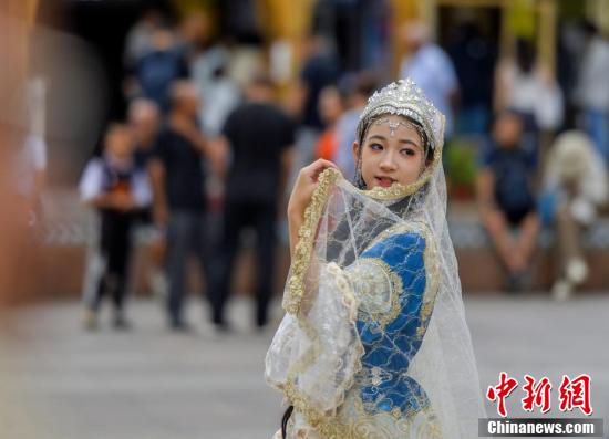 8月12日,新疆烏魯木齊市大巴扎步行街,游客穿著經(jīng)過(guò)改進(jìn)的民族服飾拍攝高清寫(xiě)真照。