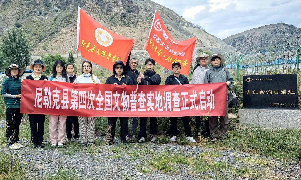 尼勒克縣第四次全國文物普查工作隊在吉仁臺溝口遺址合影。新華社發(fā)(受訪者供圖)