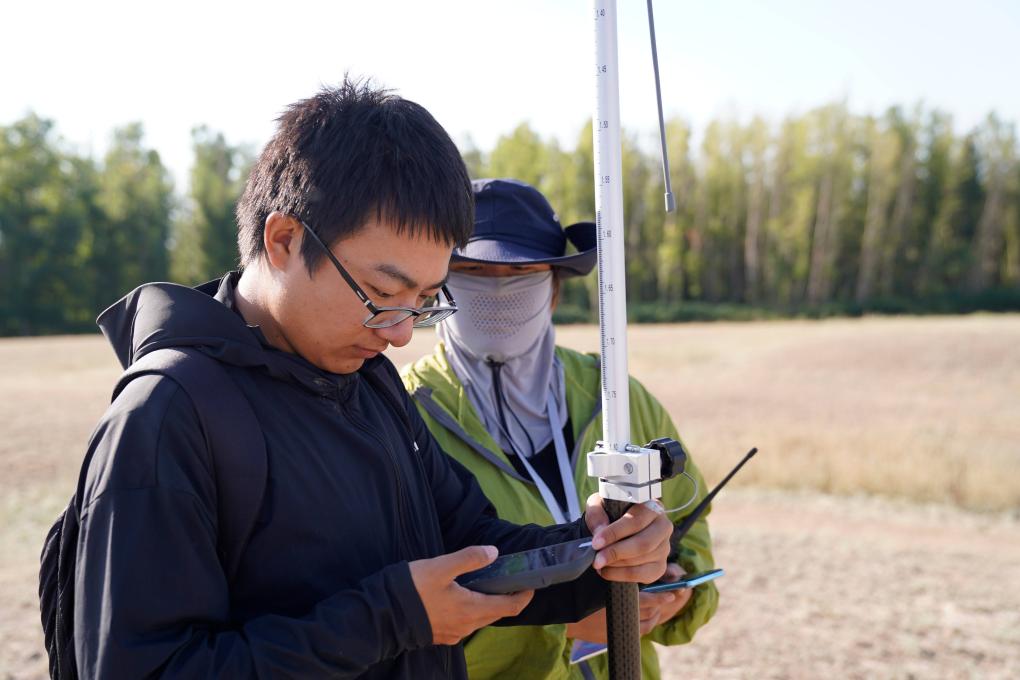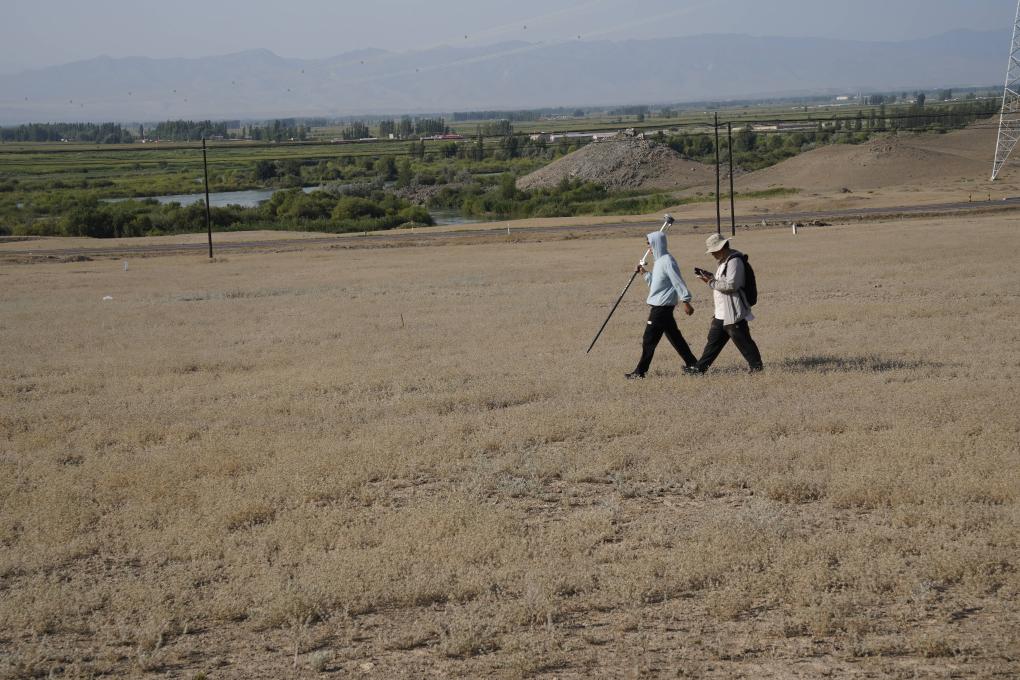 尼勒克縣第四次全國文物普查工作隊隊員魏中暢(左一)手持RTK測量儀,復(fù)核文物信息。新華社記者 白志強 攝