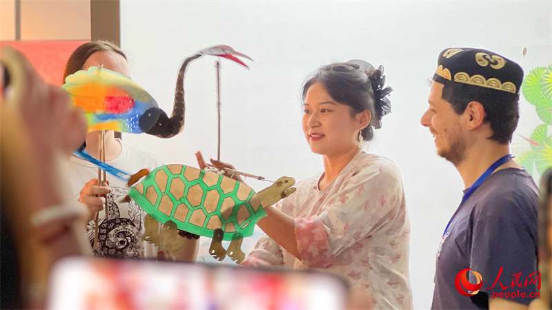 俄羅斯翻譯家、現(xiàn)任莫斯科物理技術(shù)學(xué)院中文系副教授羅子毅與皮影合影。人民網(wǎng) 李欣洋攝