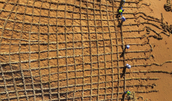 治沙工人在寧夏中衛(wèi)市境內(nèi)的騰格里沙漠鋪設(shè)刷狀網(wǎng)繩式草方格沙障(2024年5月30日攝,無人機(jī)照片)。