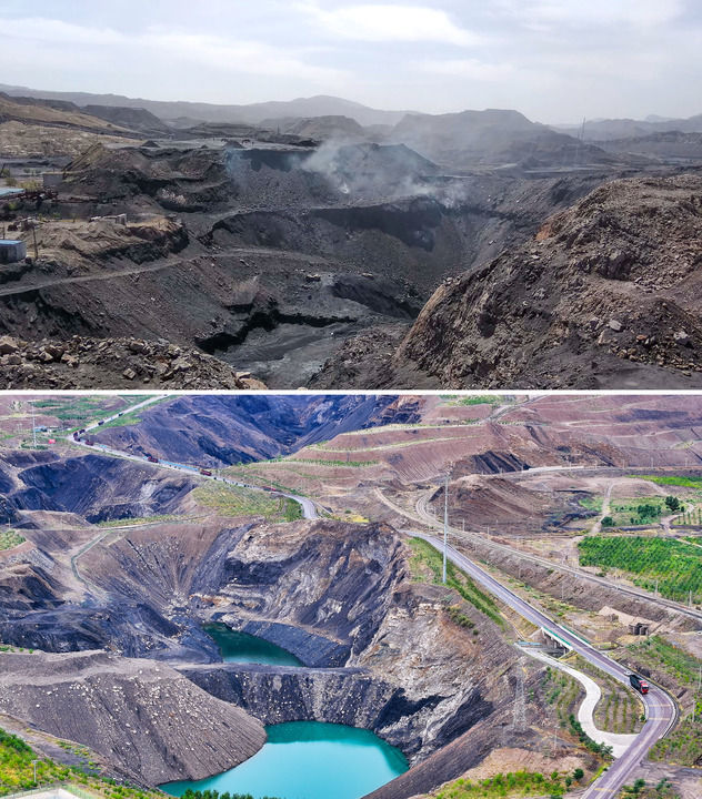 拼版照片,上圖為:位于寧夏石嘴山市的賀蘭山石炭井礦區(qū)(2017年5月30日攝,新華社發(fā));下圖為:2024年8月6日拍攝的修復(fù)治理后的賀蘭山石炭井礦區(qū)(無人機(jī)照片,新華社記者馮開華攝)。