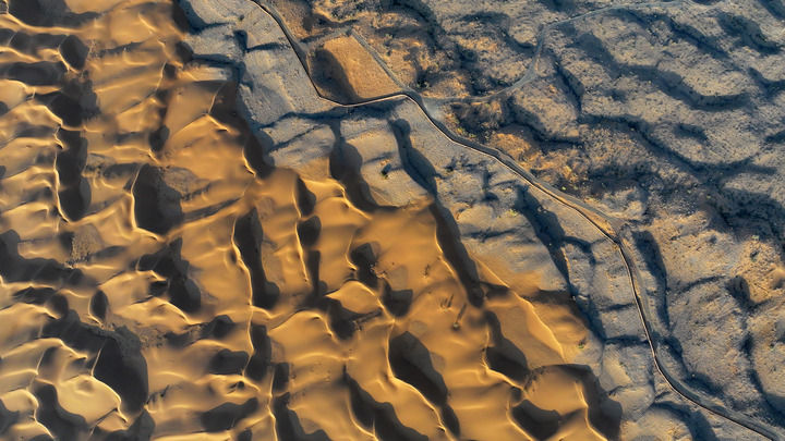 位于寧夏中衛(wèi)市沙坡頭騰格里沙漠邊緣的治沙林帶與沙漠交匯處(2023年9月6日攝,無人機(jī)照片)。