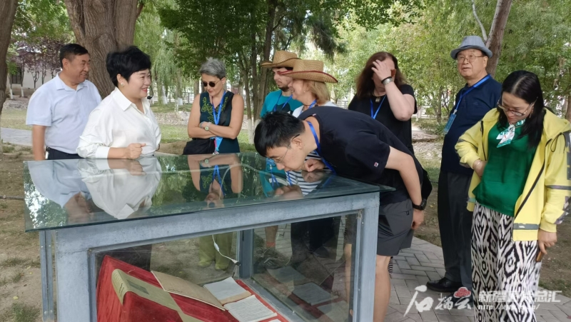 8月16日,中外漢學(xué)家、翻譯家、作家在察布查爾錫伯自治縣察布查爾報(bào)社參觀。石榴云/新疆日?qǐng)?bào)記者 宋衛(wèi)國攝