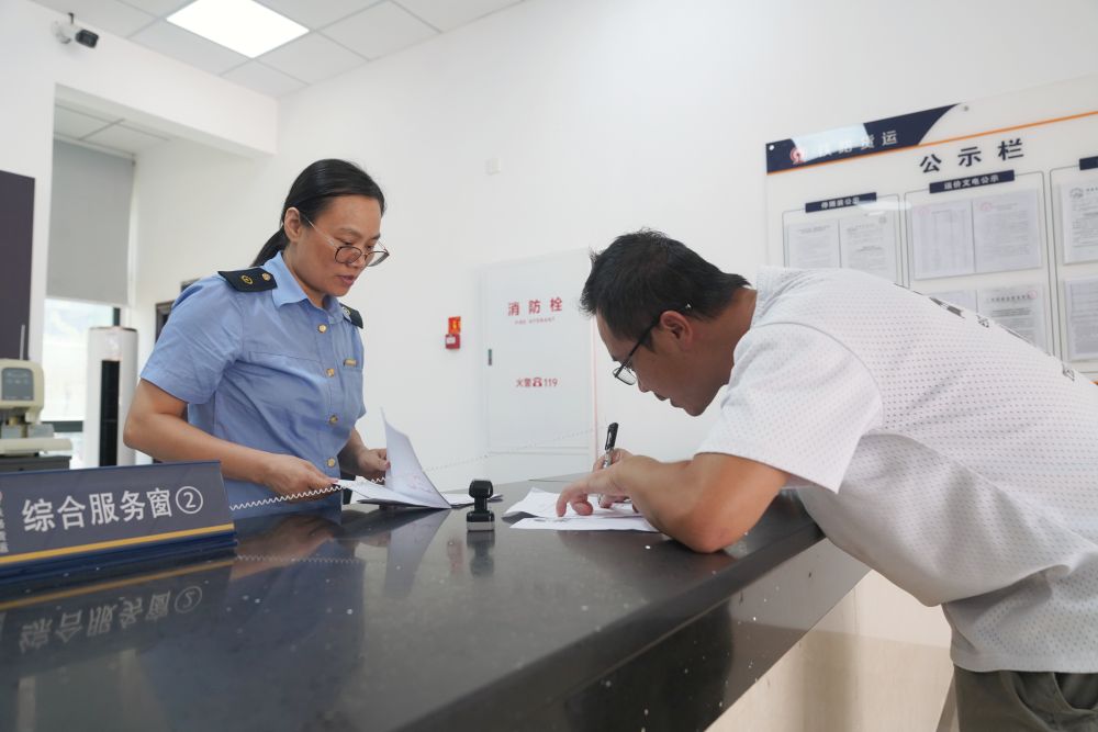 南寧國(guó)際鐵路港貨運(yùn)營(yíng)業(yè)廳工作人員指導(dǎo)客戶辦理業(yè)務(wù)。(國(guó)鐵南寧局供圖)