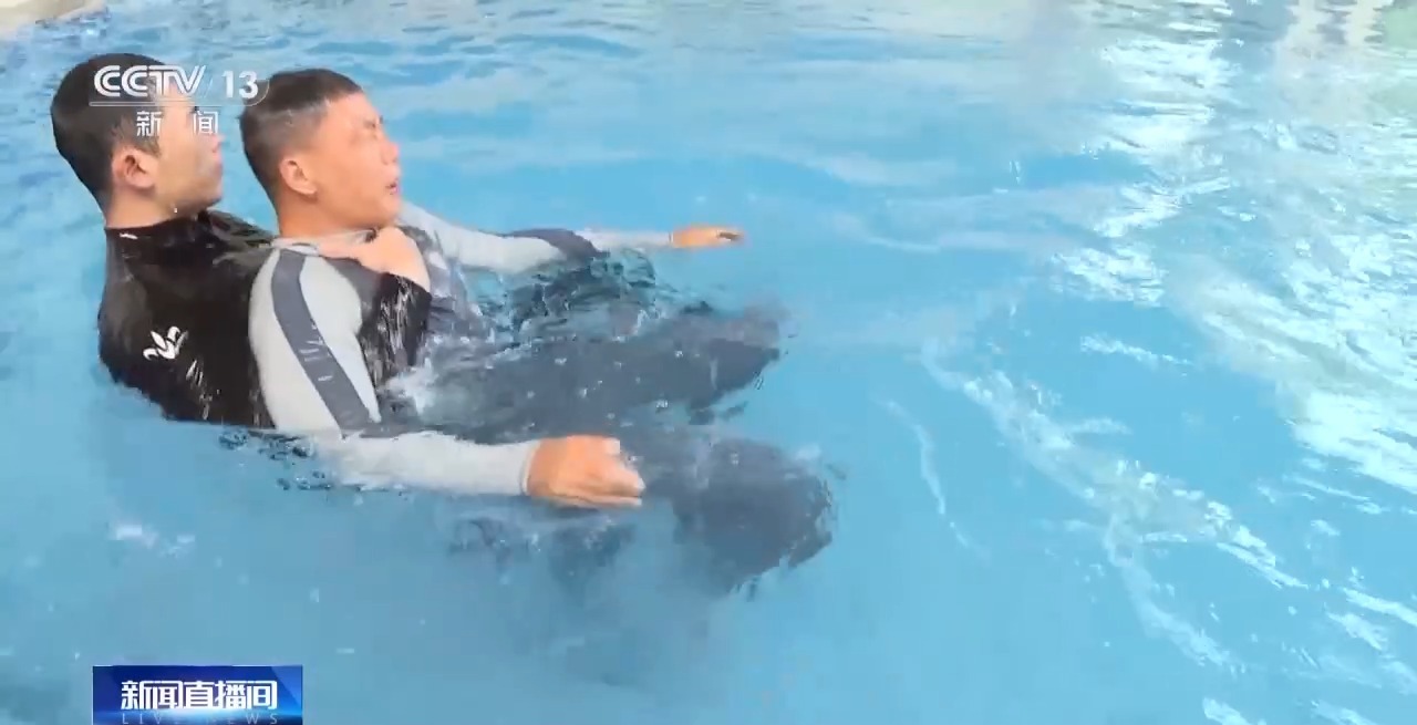 國(guó)家消防救援局水域救援訓(xùn)練基地教練員 李勝龍:我們不要正面游向他,要盡量從他的背后,然后靠近他的時(shí)候要轉(zhuǎn)動(dòng)他的髖部,使他背向我,因?yàn)槟缢咚诨艁y的時(shí)候會(huì)抓緊我們的身體,也就是我們俗稱(chēng)的“抓緊最后一根稻草”。他會(huì)死死抓住我們,影響我們的救援,所以說(shuō)我們要從背后接近他,然后托住他的頭部 、頸部,使他的頭部始終露出水面,降低他的恐慌。
