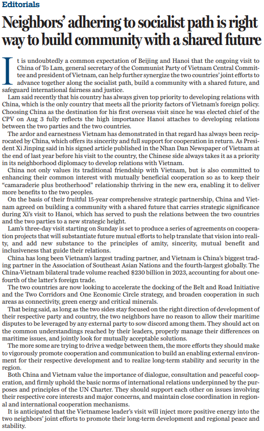 越共中央總書記、國家主席蘇林于8月18日至20日來華國事訪問。中越雙方期待此訪進(jìn)一步加強(qiáng)兩國在推進(jìn)社會(huì)主義建設(shè)事業(yè)、構(gòu)建中越命運(yùn)共同體、維護(hù)國際公平正義方面的合作。