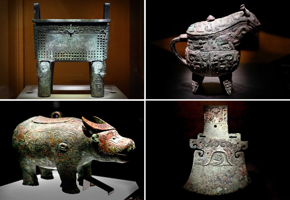 這是2024年2月23日拍攝的河南安陽殷墟博物館新館內(nèi)展出的“司母辛”銅鼎(左上)、“亞長”銅?。ㄓ疑希ⅰ皝嗛L”牛尊(左下)、“亞長”銅鉞(拼版照片)。新華社記者 李安攝