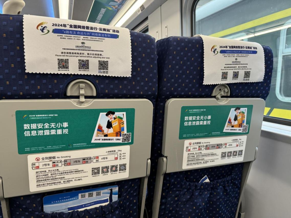據(jù)介紹,專列的8個主題車廂分別以“中國網(wǎng)絡(luò)法治三十年”“網(wǎng)絡(luò)安全”“數(shù)據(jù)安全”“未成年人網(wǎng)絡(luò)保護”“數(shù)據(jù)出境之旅”“反網(wǎng)暴凈網(wǎng)行動”“個人信息守護”以及“網(wǎng)絡(luò)空間命運共同體”命名,通過鏡框海報、玻璃貼、小桌板貼、行李架彩貼、頭枕片、車內(nèi)LED信息屏等形式多樣的載體,全面展示網(wǎng)絡(luò)法治30年成就、網(wǎng)絡(luò)空間命運共同體主張。讓乘客們在享受舒適旅途的同時,也能輕松學習到實用的法律信息。