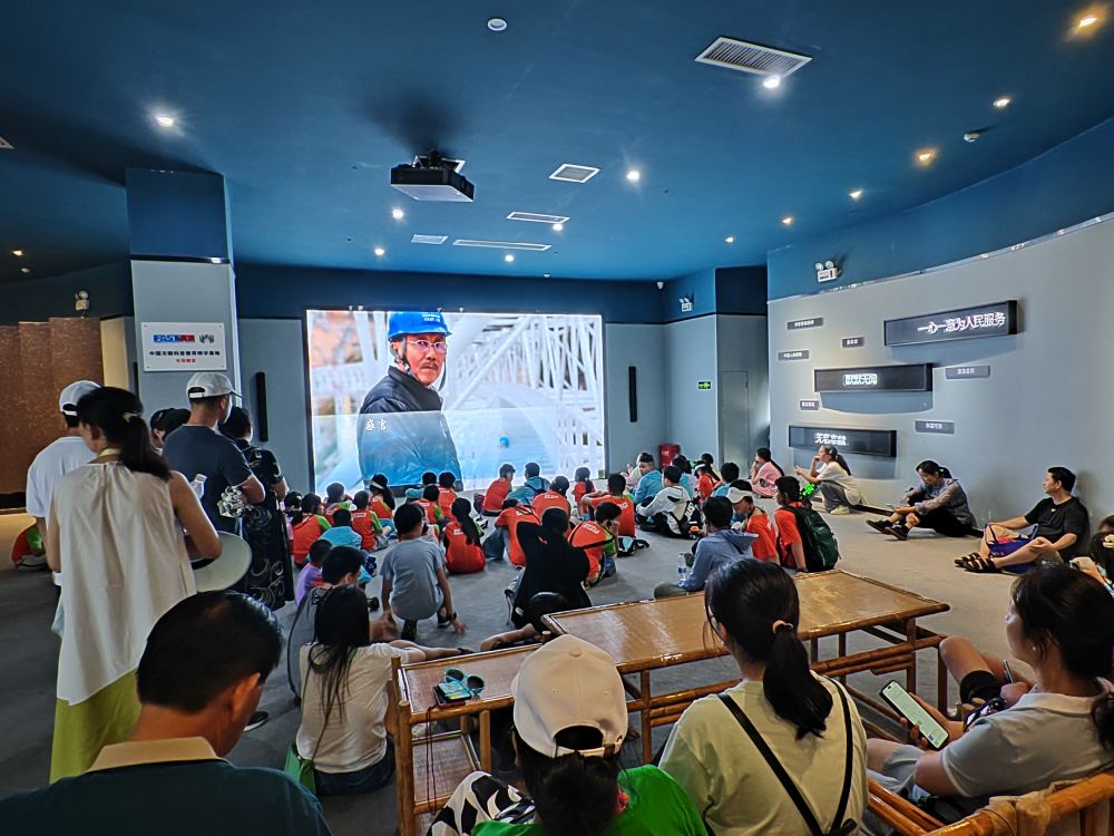 8月14日,來自河南鄭州研學(xué)團(tuán)隊(duì)的中小學(xué)生在南仁東事跡館觀看影片。新華社記者 齊健 攝