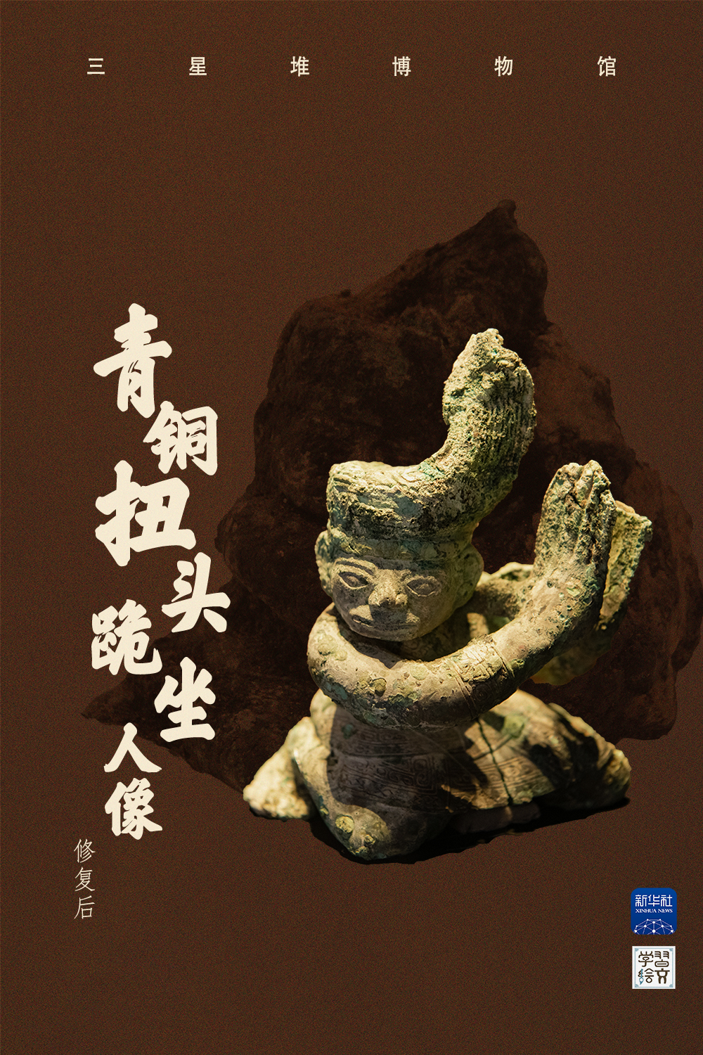 這是三星堆博物館文物保護與修復館拍攝的修復后的青銅扭頭跪坐人像。