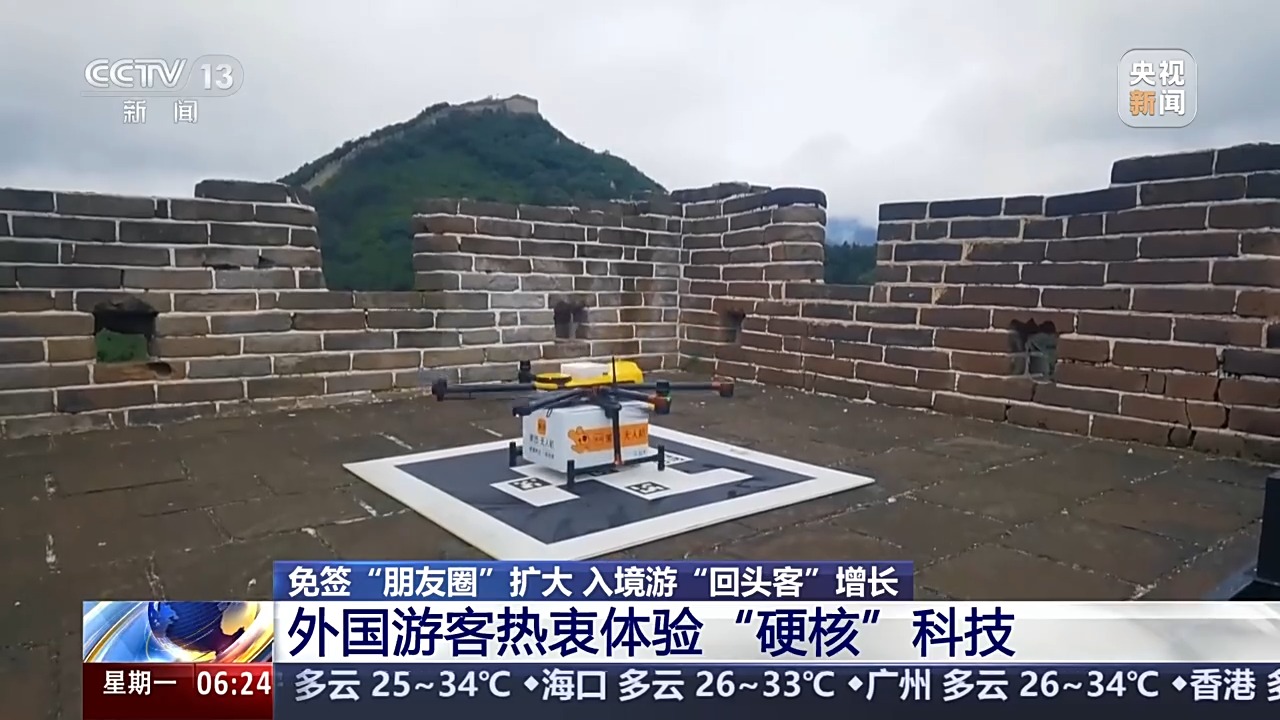 北京八達(dá)嶺長城近期開通了無人機(jī)“送外賣”服務(wù),最快5分鐘,來自山下的酸梅湯、雪糕、創(chuàng)可貼等商品就能送到長城上來。