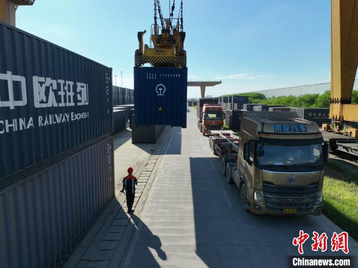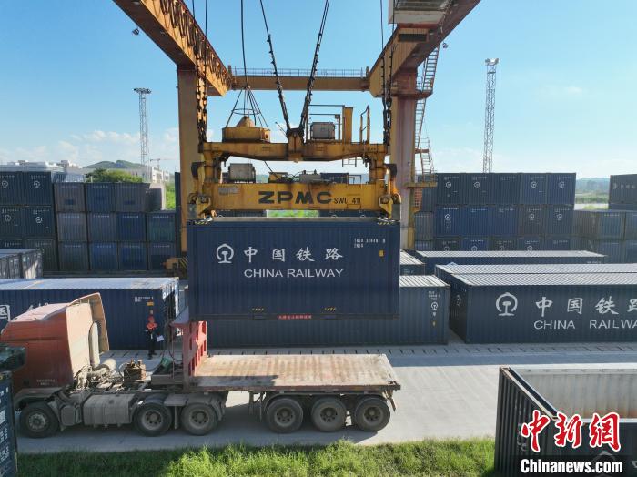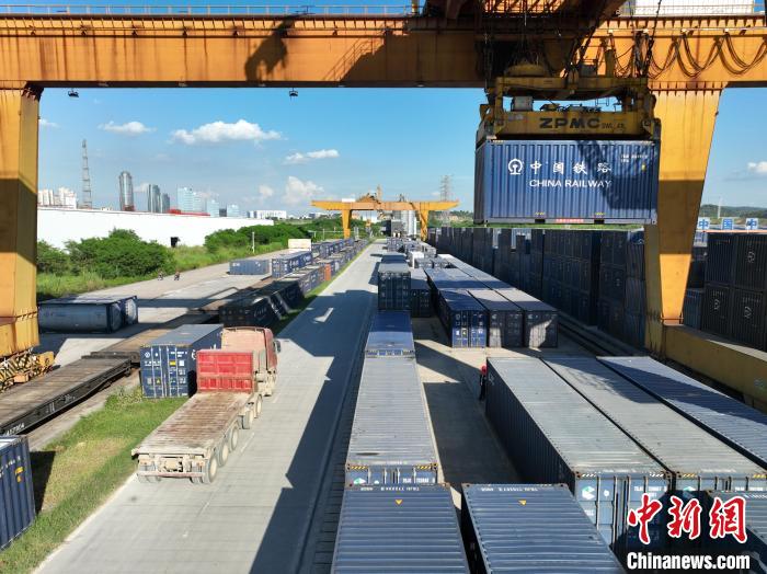 8月26日,廣西南寧國際鐵路港內(nèi),鐵路職工頂著下午的烈日,正在為發(fā)往越南的貨運班列裝卸貨物。該鐵路港是廣西始發(fā)中越班列的核心場站。國鐵南寧局提供的信息顯示,今年前7個月,廣西始發(fā)中越班列累計發(fā)運貨物6850標(biāo)箱,同比增長16倍;其中7月份發(fā)運1922標(biāo)箱,超過今年一季度發(fā)運量總和,為今年以來第三次刷新單月發(fā)運量紀(jì)錄。圖為集裝箱擺滿場站,等待裝車。王以照 攝