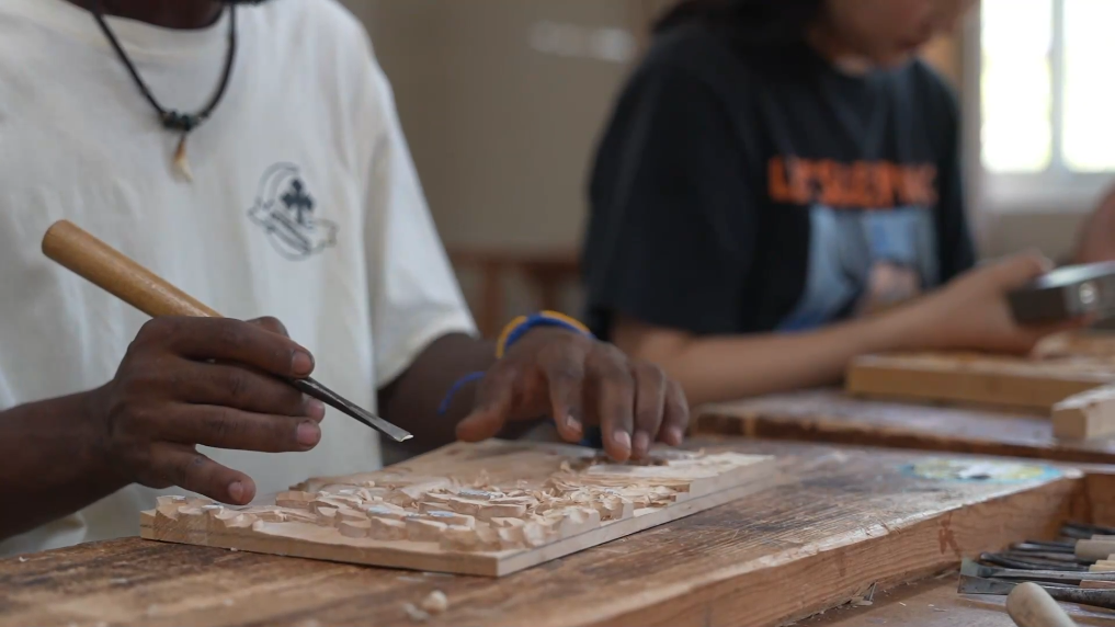 2018年,首批21名來自剛果(布)的留學(xué)生在“一帶一路”倡議下,來到位于浙江金華的浙江廣廈建設(shè)職業(yè)技術(shù)大學(xué)學(xué)習(xí)木雕技藝,成為浙江省首批木雕藝術(shù)類專業(yè)留學(xué)生,自此拉開了東陽與剛果(布)國際友好交流的序幕。