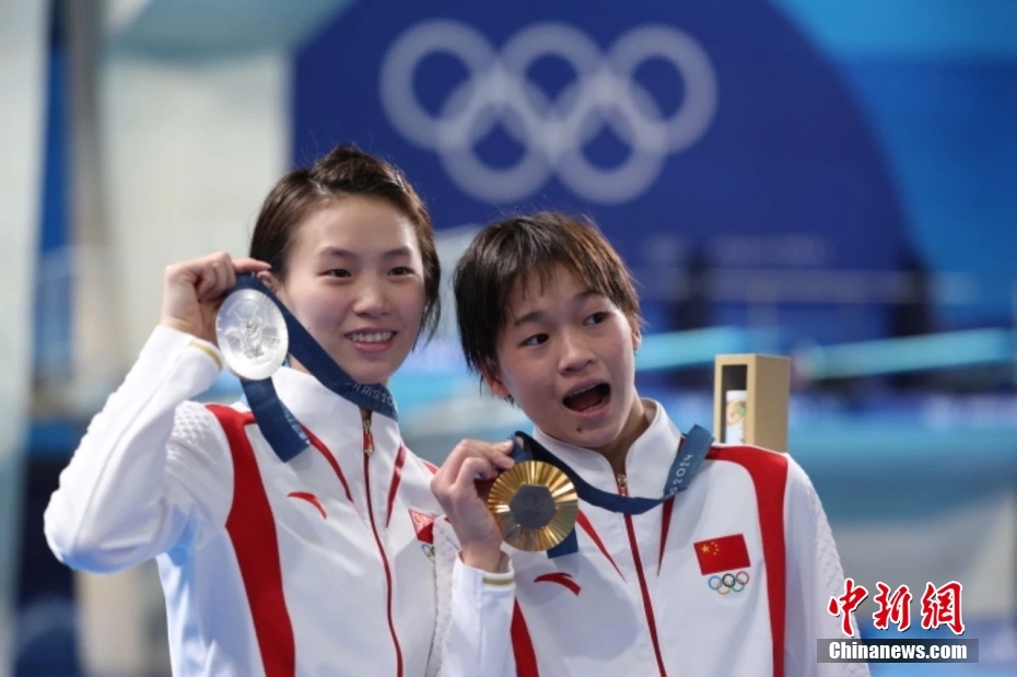 圖為陳芋汐(左)、全紅嬋(右)展示獎牌。中新社記者 富田 攝