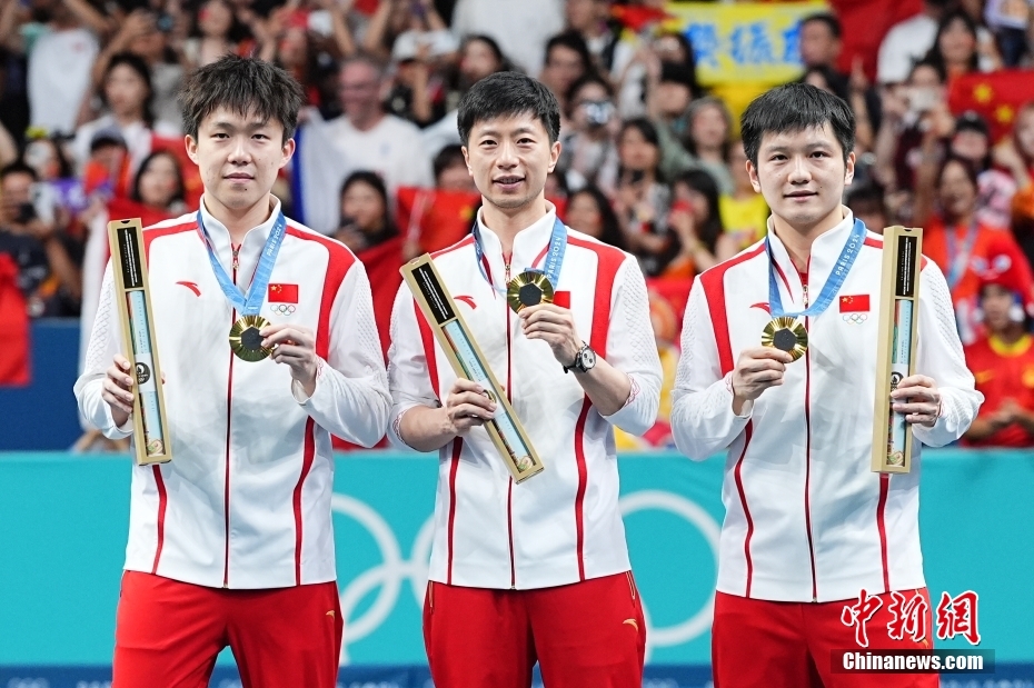 在巴黎奧運(yùn)會乒乓球男團(tuán)金牌賽中,中國隊以3比0戰(zhàn)勝瑞典隊,獲得冠軍。中新社記者 趙文宇 攝