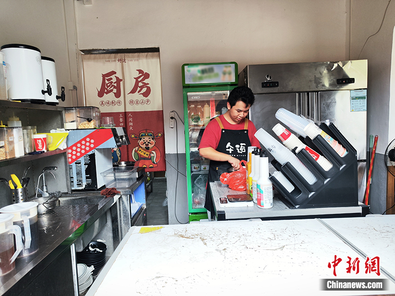 小伙叫蘭嘉祥,1999年生人,他的店鋪在今年5月1日開張,是受到政府扶持的返鄉(xiāng)創(chuàng)業(yè)項(xiàng)目之一。村里為他提供了租金優(yōu)惠,第一年免租,以鼓勵(lì)他在老街開店。與村干部溝通后,蘭嘉祥決定將店鋪定位于同時(shí)滿足本地人和游客的需求,“游客群體傾向于購(gòu)買紅糖產(chǎn)品,而村民則更偏愛奶茶飲品。”