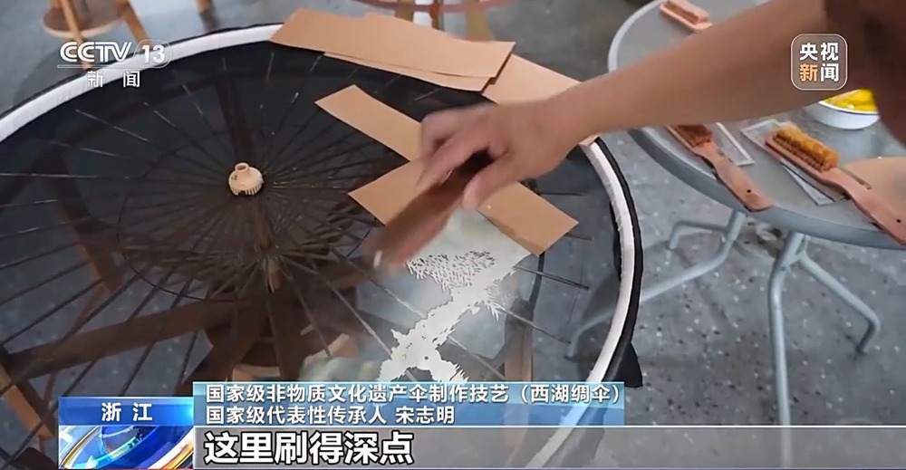 國家級非物質文化遺產傘制作技藝(西湖綢傘)國家級代表性傳承人 宋志明:刷出來的圖案有靈動感,這是其他噴繪、繪畫所出不來的效果,特別是在絲綢傘面上來畫,通過顏料的霧狀,刷花呈現(xiàn)的效果是獨一無二的。