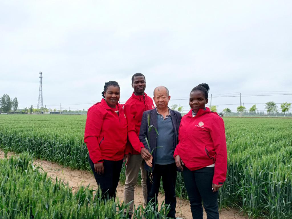 “中非科技小院”留學(xué)生庫(kù)瓦莉(左一)和同學(xué)們?cè)谖挥诤颖鼻艿霓r(nóng)戶(hù)試驗(yàn)田和當(dāng)?shù)剞r(nóng)民學(xué)習(xí)農(nóng)業(yè)生產(chǎn)技術(shù)間隙合影(5月10日攝)。新華社發(fā)(受訪(fǎng)者供圖)