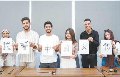 7月3日,埃及中國圖書中心揭牌儀式在埃及開羅巴德爾大學(xué)舉辦。圖為參加活動的埃及大學(xué)生展示書法。