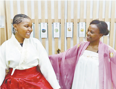 當(dāng)?shù)貢r(shí)間4月20日,為慶祝第十五個(gè)聯(lián)合國中文日,南非德班理工大學(xué)孔子學(xué)院舉辦以“說文解字,以茶會友”為主題的活動。活動參與者身穿中國傳統(tǒng)服飾,共同探討漢字和茶文化。圖為兩名當(dāng)?shù)嘏⒃嚧┲袊鴤鹘y(tǒng)服飾。
