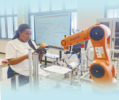 埃塞俄比亞魯班工坊由天津職業(yè)技術(shù)師范大學(xué)與埃塞聯(lián)邦職業(yè)技術(shù)培訓(xùn)學(xué)院合作建立,于2021年4月揭牌啟運(yùn),聚焦人工智能領(lǐng)域,對接當(dāng)?shù)睾献髟盒5碾姎庾詣踊c控制技術(shù)管理等專業(yè)。圖為當(dāng)?shù)貙W(xué)生在操作工業(yè)機(jī)器人。