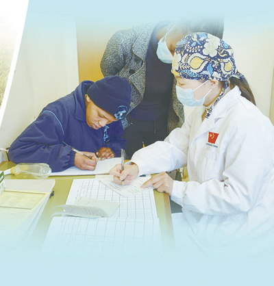 自1997年以來,中國湖北省承擔(dān)向萊索托王國派遣醫(yī)療隊(duì)的任務(wù),醫(yī)療隊(duì)隊(duì)員在當(dāng)?shù)卦\治了大量常見病、多發(fā)病,治愈了眾多疑難病癥,深受萊索托民眾歡迎與尊敬。圖為第十八批中國援萊索托醫(yī)療隊(duì)醫(yī)生王琦正在接診患者。