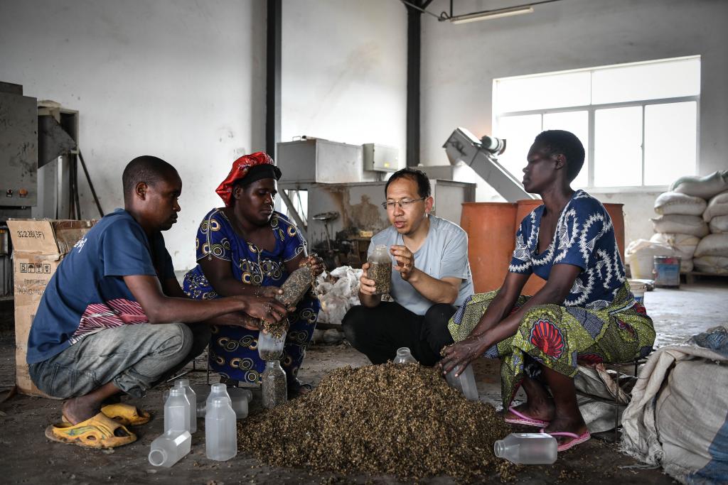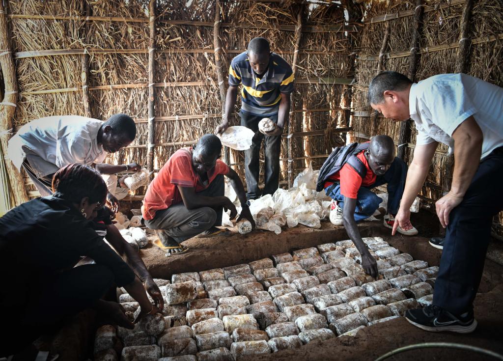 8月13日,在盧旺達(dá)南方省胡耶區(qū)的中國(guó)援盧農(nóng)業(yè)技術(shù)示范中心,菌草專家陳曉斌(右二)與當(dāng)?shù)剞r(nóng)民一起制作菌種培養(yǎng)料。