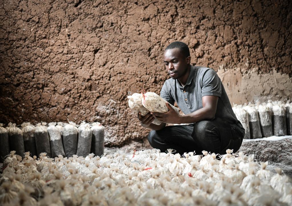 8月14日,在盧旺達(dá)南方省穆漢加區(qū),尼揚(yáng)博·奧貝德在食用菌培育工坊內(nèi)檢查菌袋。曾兩次赴中國(guó)進(jìn)行菌草技術(shù)培訓(xùn)的尼揚(yáng)博·奧貝德在南方省和東方省各擁有一家工坊。