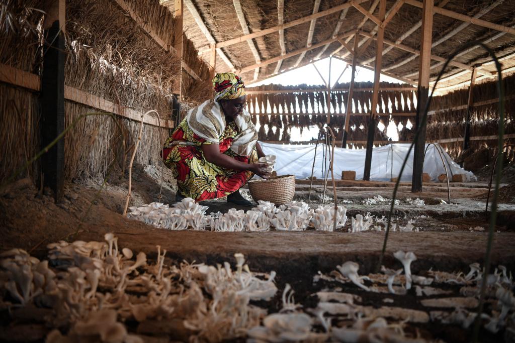 在中非共和國(guó)達(dá)馬拉市一處貧困村落里,法蒂姆·阿巴·雷基亞正在自家的菇棚內(nèi)收獲鮮菇。