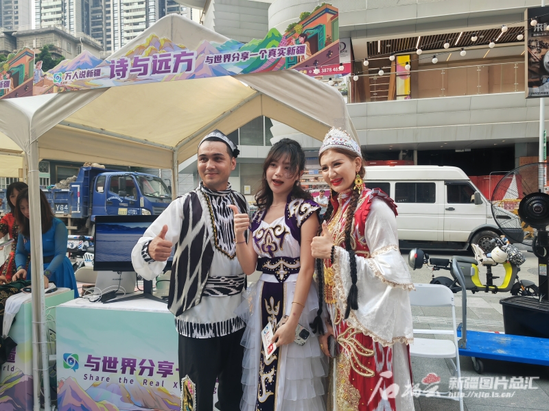 9月2日,“萬人說新疆”走進廣東分享會之新疆特色文化主題“大巴扎”在廣州市越秀區(qū)289藝術(shù)創(chuàng)意園區(qū)北廣場舉行。廣州市民陳婕(中)穿著新疆民族服飾與舞蹈演員合影留念。石榴云/新疆日報記者 甘興華攝