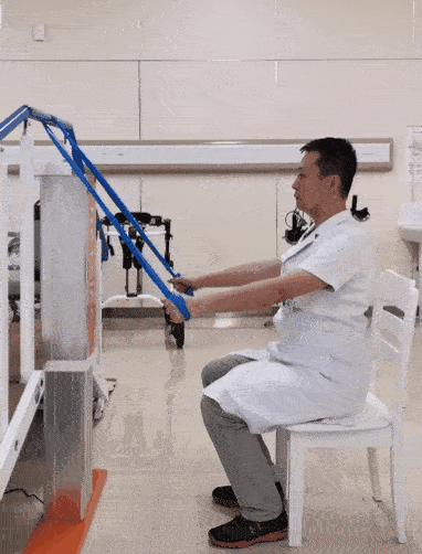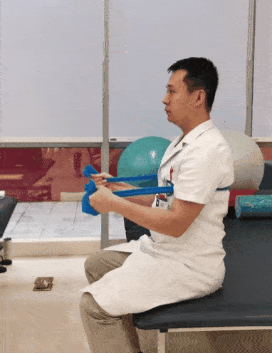將彈力帶繞過身體前方的橫桿等固定物體,兩端纏繞于雙手上。坐位,身體保持正直,兩手緩慢向下拉動(dòng)彈力帶,直至彈力帶呈緊繃狀態(tài)。然后,緩慢還原至初始姿勢。此為一個(gè)完整動(dòng)作。8~12次/組,做3組。