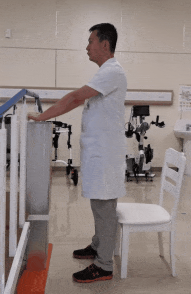 雙腳分開,雙手扶在墻面或扶手上,保證平衡。足跟緩慢抬起,停留一會兒,然后恢復(fù)至初始動(dòng)作。此為一個(gè)完整動(dòng)作。8~12次/組,做3組。