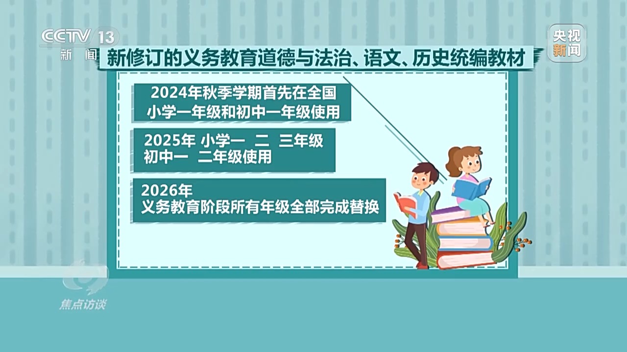 今年秋季學(xué)期,修訂后的教材在小學(xué)一年級和初中一年級投入使用;2025年,小學(xué)一、二、三年級和初中一、二年級使用;2026年,義務(wù)教育階段所有年級全部完成替換。