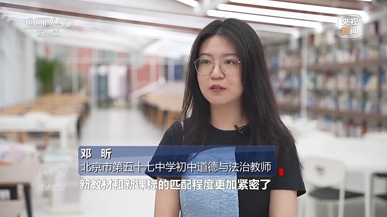 北京市第五十七中學(xué)初中道德與法治教師 鄧昕:新教材和新課標(biāo)的匹配程度更加緊密了,突出了核心素養(yǎng)里的重視實踐這個環(huán)節(jié),讓學(xué)生們從理論課堂走到社會實踐。