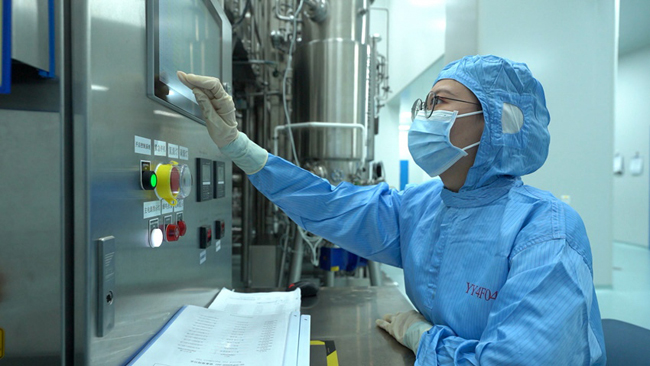 藥企生產(chǎn)人員在控制制藥設備。金賽藥業(yè)供圖