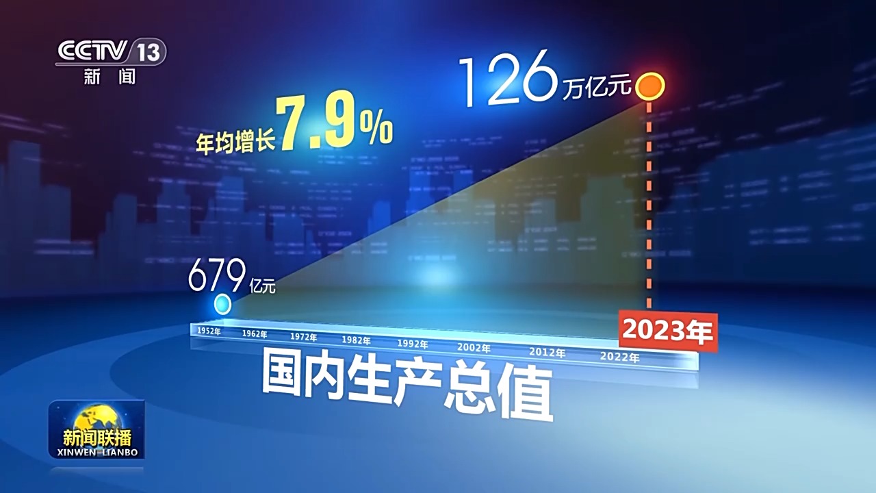 我國國內(nèi)生產(chǎn)總值,從有數(shù)據(jù)統(tǒng)計以來的1952年的679億元,增長到2023年的126萬億元,年均增長7.9%。