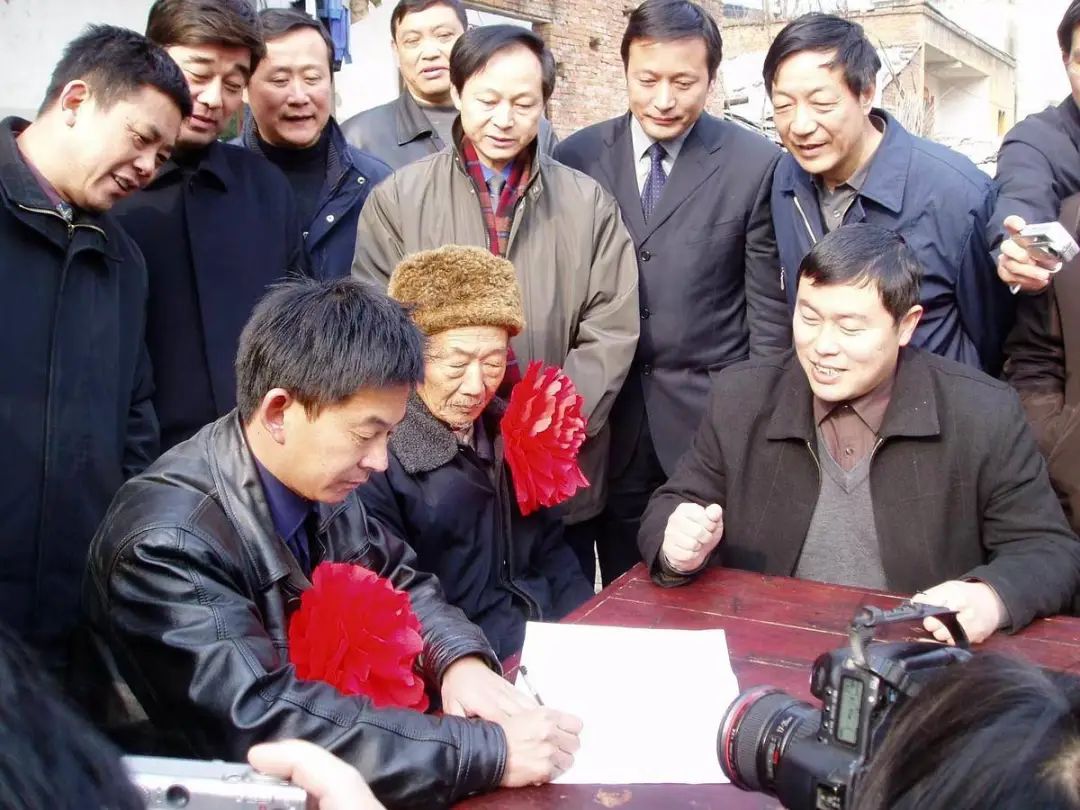 2005年1月5日,丹江口市三官殿辦事處馬灣村村民王瑞權(quán)(左一)與辦事處負(fù)責(zé)人簽訂搬遷合同,成為南水北調(diào)中線工程移民搬遷第一戶。(湖北日報通訊員 陳華平 攝)