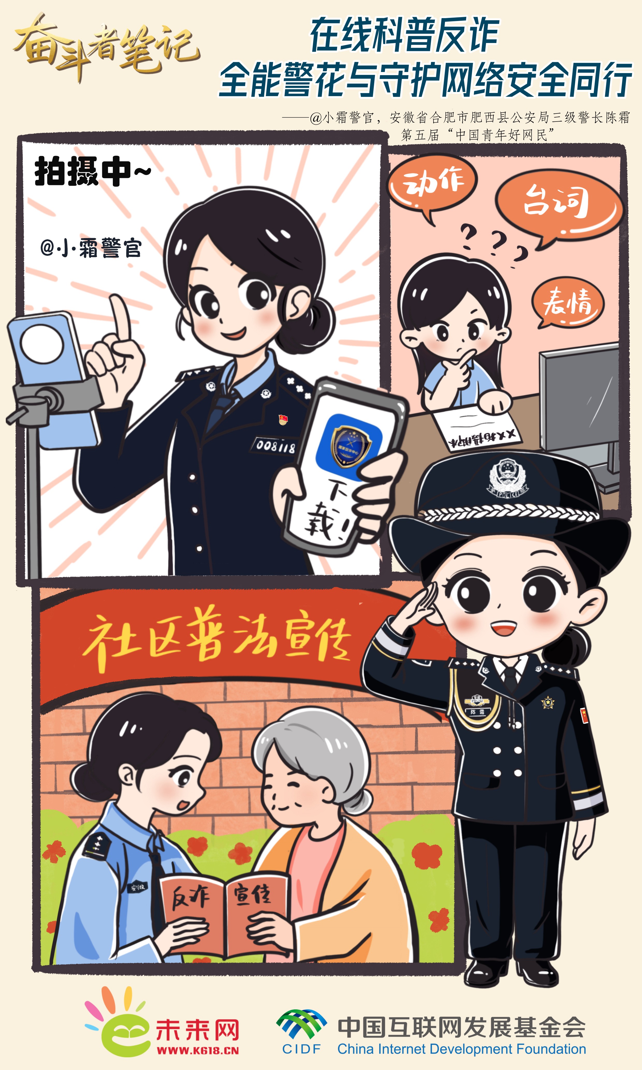 “一網(wǎng)情深”筑防線,心系百姓護(hù)安寧。面對(duì)在辦案過程中遇到的百姓養(yǎng)老錢、救命錢被騙的情況,陳霜愈發(fā)感到防范電詐和打擊電詐同樣重要。她創(chuàng)建“小霜警官”警務(wù)自媒體賬號(hào),認(rèn)真研究分析電信網(wǎng)絡(luò)詐騙的規(guī)律特點(diǎn)、思考防詐辦法,用大家喜聞樂見的形式為百姓普法、宣傳反詐知識(shí)。她還積極探索宣傳新路徑,緊跟時(shí)事熱點(diǎn),將防詐知識(shí)寫成幽默風(fēng)趣的段子、引人入勝的故事和生動(dòng)的短劇。自2016年以來,“小霜警官”累計(jì)推出了反詐、普法、便民等內(nèi)容原創(chuàng)短視頻500余個(gè),總粉絲量過800萬,全平臺(tái)播放量超50億。正如她的個(gè)性簽名所寫——“一個(gè)特別接地氣的警察朋友”,親民的形象和接地氣的宣傳方式,讓她受到了廣大網(wǎng)友的關(guān)注和喜愛。