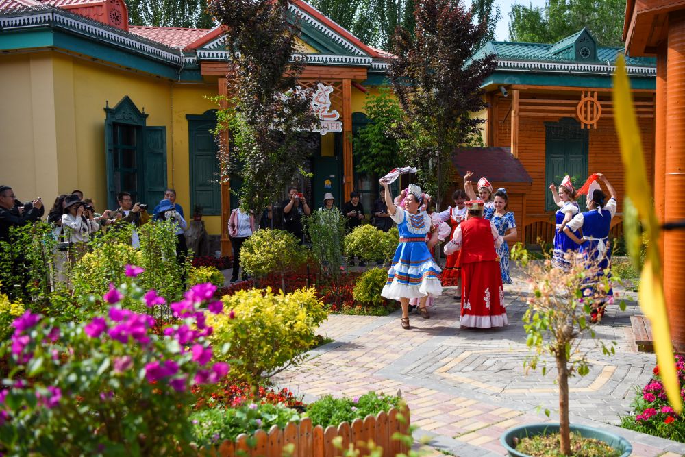 在新疆伊犁哈薩克自治州伊寧市六星街,當地居民跳起舞蹈歡迎遠方來客。新華社記者 丁磊 攝