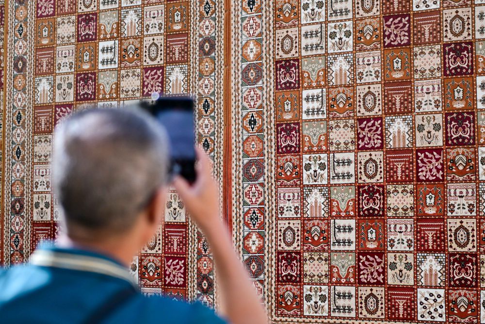 步入龜茲小巷,一幅巨大的地毯墻首先映入眼簾,地毯上大大小小的方格整齊排列,圖案精美對(duì)稱、色彩艷麗。地毯是新疆少數(shù)民族家庭中最常見(jiàn)的裝飾品,一般以羊毛剪裁編織而成,集繪畫(huà)、雕刻、編織、刺繡、印染等手工技藝于一體,是展現(xiàn)新疆民族風(fēng)情的典型物品之一。