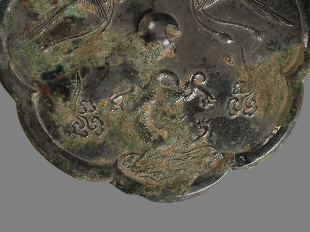 銅鏡呈八瓣葵花形,在中央的鏡鈕四周,自下而上分三個部分構成了由水面到天空的立體空間。最下層為波光粼粼的一汪水面,雖然這一部分留存有因長期埋藏地下而產(chǎn)生的銹跡,但仍依稀可辨碧波之上有一條昂首翹尾的龍。它四肢張開,龍尾反折向龍首上方并纏繞于一足之上,龍身兩側(cè)各一朵祥云,襯托出神龍騰躍翻飛的身姿。