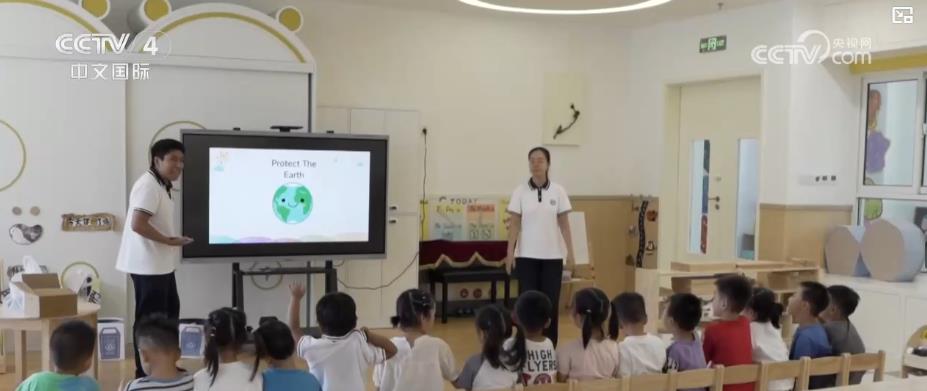 在雄安白塔幼兒園里,美國(guó)外教佩雷斯正在教孩子們?nèi)绾芜M(jìn)行垃圾分類。